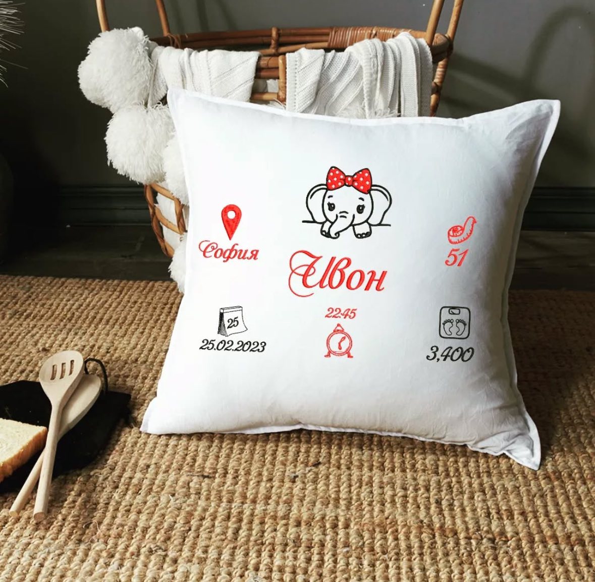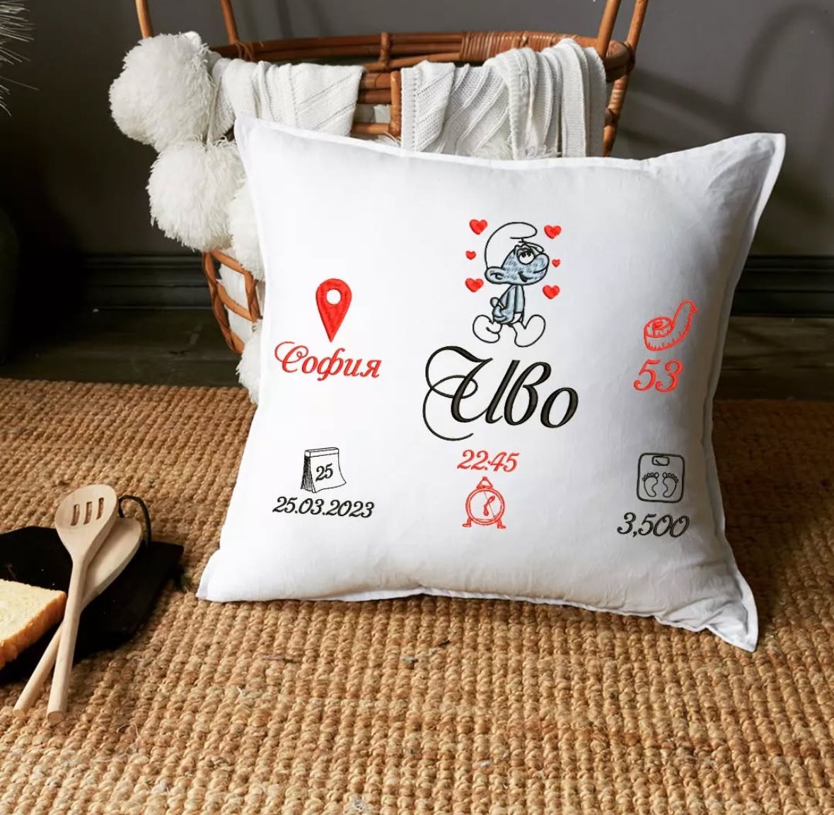 Създайте неповторим и емоционален подарък за новородено с персонализирана възглавница (40x40 см), която ще запази най-важните първи моменти. Възглавничката включва името на детето, датата, часа и мястото на раждане, а нежните илюстрации със слонче, котенце или смърфче ѝ придават приказен чар.